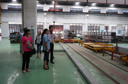 (總監(jiān)在全亞洲第一條月產(chǎn)量5000T全自動立式氧化電泳線車間現(xiàn)場向貴賓介紹我司自動輸送線等先進(jìn)設(shè)備)