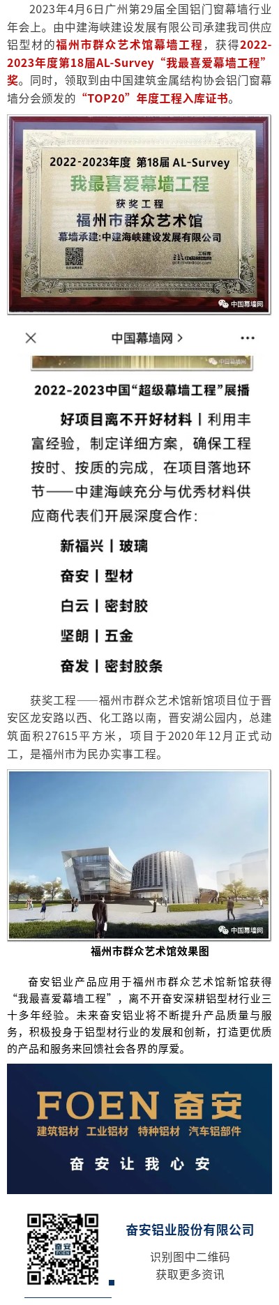 喜報|奮安鋁材產(chǎn)品應(yīng)用于“福州市群眾藝術(shù)館”加冕2023工程獎