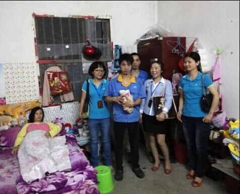 (工會主席陳凌芹攜噴涂車間副主任李毅、行政主管陳學(xué)碧、人資主管李慧英將善款送至周龍本人手中)